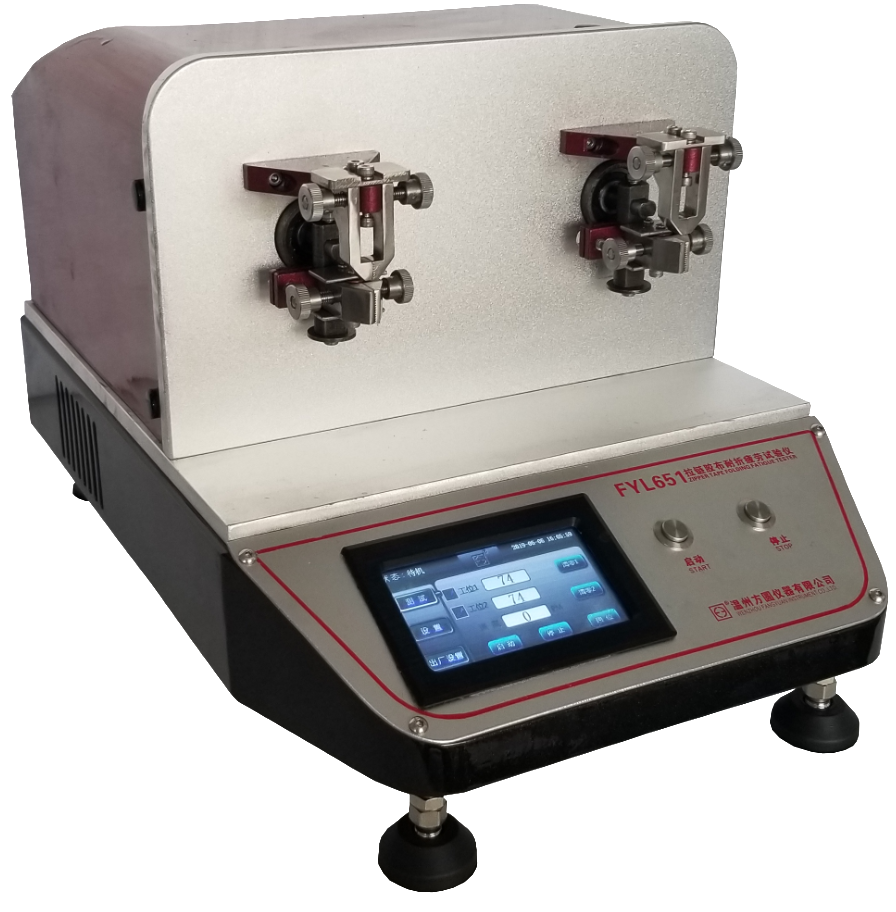 FYL651拉鏈膠布耐折疲勞試驗儀配有2工位,可分別通過上夾具固定拉鏈膠布一端,同時根據拉鏈型號調整下夾具的初始位置后將另一端用下夾具固定鎖好,并通過設定不同的測試速率以及調整不同的測試角度(機械調整)使下夾具圍繞上夾具頂點為圓心做反復運動,模擬拉鏈膠布在日常使用過程中的狀態,檢測拉鏈膠布的耐折疲勞性能。