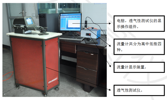 工作原理:當試樣正反兩面達到規定的壓差時,測試單位時間內垂直流過試樣一定面積的氣流流量。