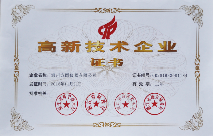 熱烈慶祝溫州方圓儀器有限公司通過高新技術企業復審,順利獲得浙江省高新技術企業證書